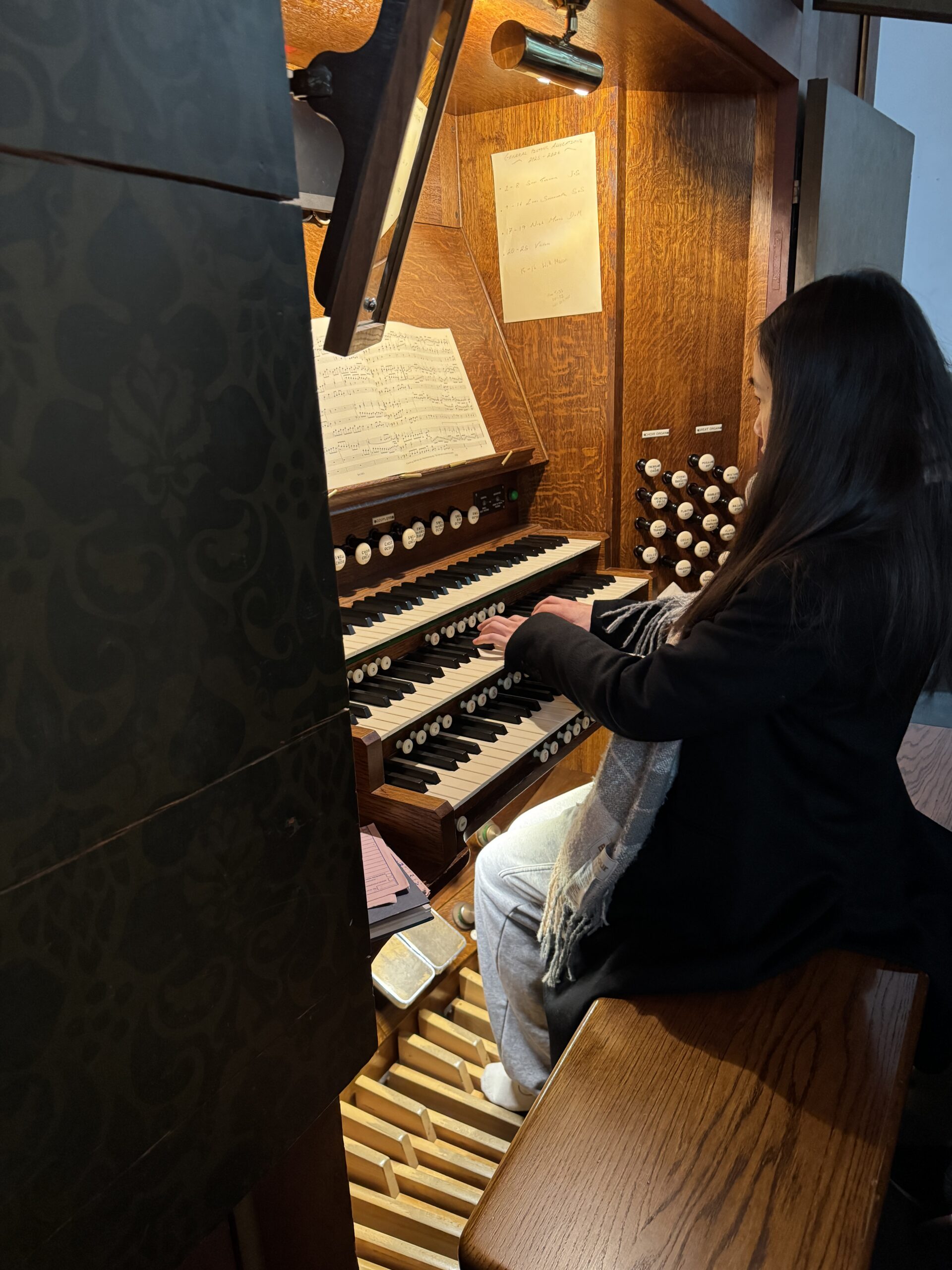 Marcus Y, Stephanie O and Anna S on their organ workshop with Nicholas Morris at Queen’s College:
