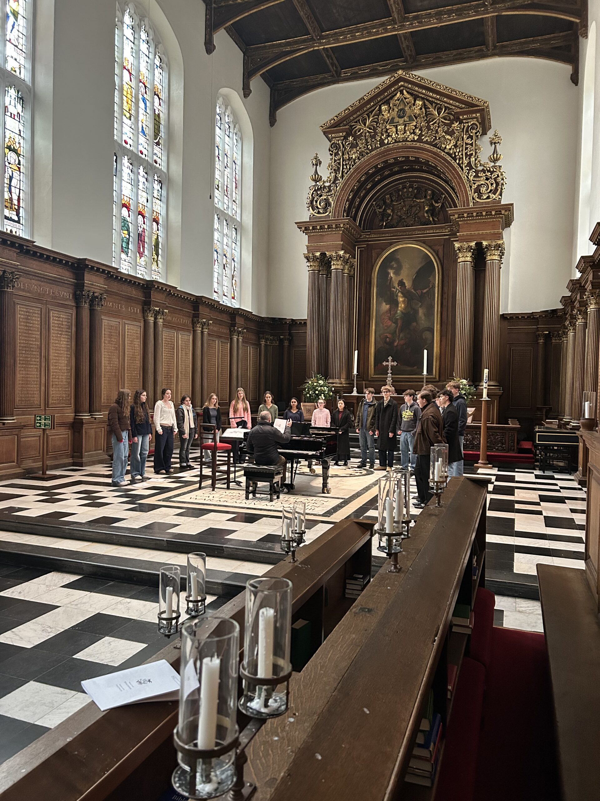 On Monday 26th July, our Schola Cantorum and pupil organists visited Cambridge University for a day of workshops and masterclasses. The choir began in the Chapel of Trinity College, working with Steven Grahl (Director of Music at Trinity and Director of the Oxford Bach Soloists), while the organists visited Nicholas Morris at Queen’s College. After some free time, we reconvened at Pembroke College for a masterclass with Luke Fitzgerald (Director of Music at Pembroke), culminating in a reflective service of Compline in their beautiful 1665 Chapel, designed and built by Christopher Wren.
