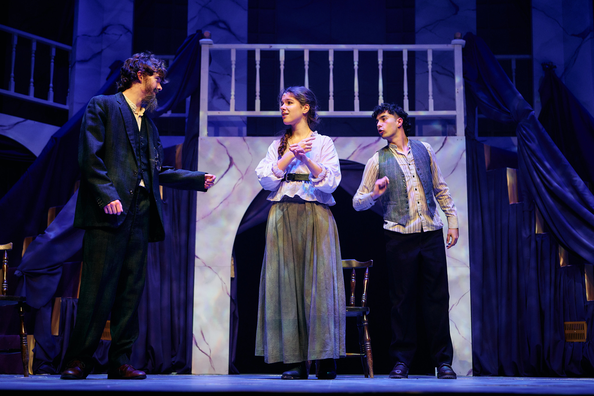 The energy lifted with the arrival of Vlad and Dmitry, whose chemistry and comic timing brought warmth and momentum to the production. The three street girls, Marfa, Paulina and Dunya (Camilla I, Alida M, Ella G), added a layer of humour to the scenes as they each tried to be the Anastasia impostor.